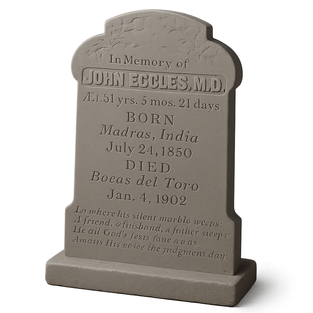 RH ABRIL 1 1902 OBITUARIO. ECCLES. – Died at Unite Fruit Company’s Hospital, Bocas del Toro, Colombia, S.A., Jan. 18, 1902, Dr. John Eccles, aged 51 years, 5 months.